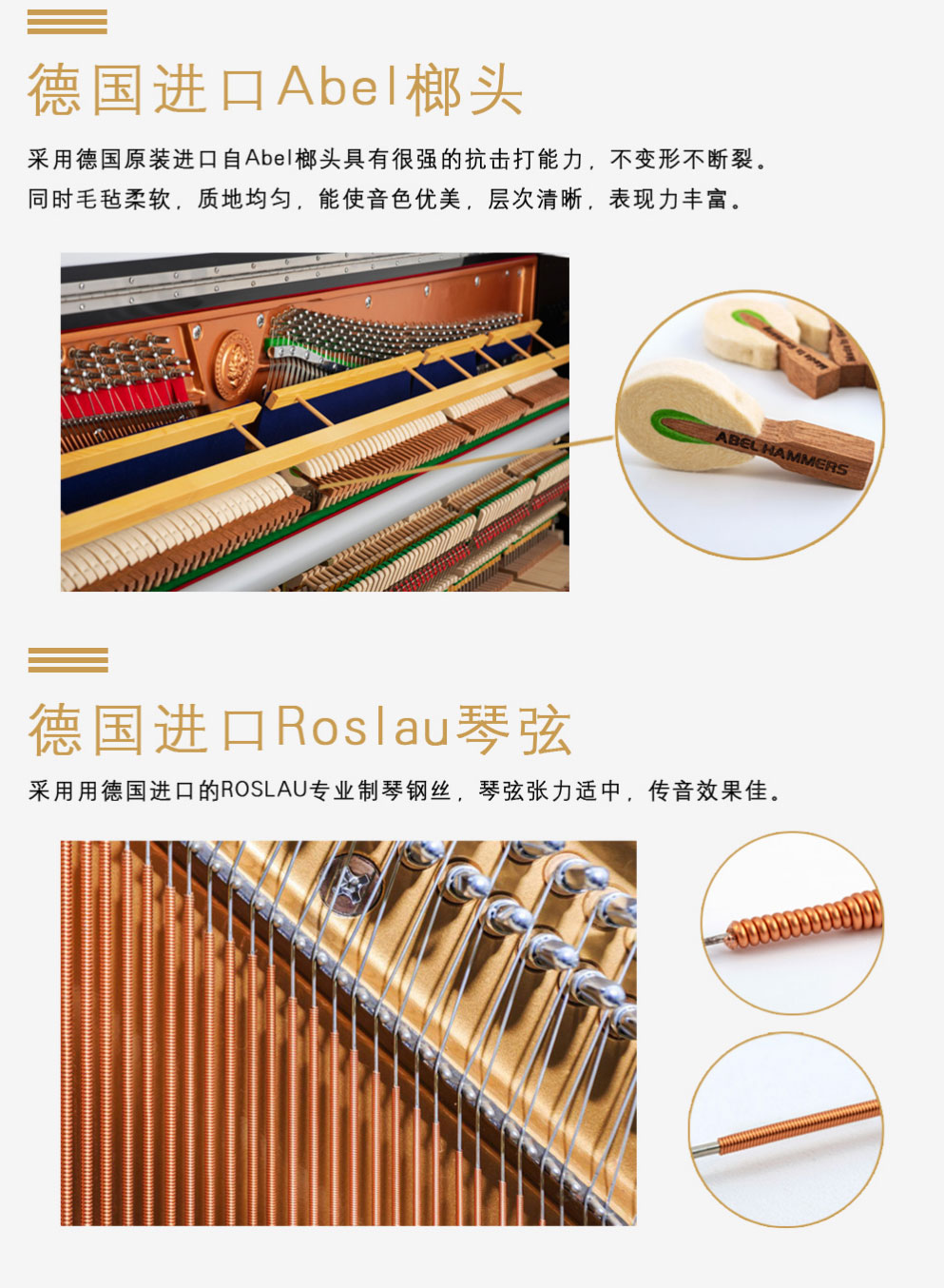 ◆ 進(jìn)口德國FFW弦槌氈,德國成型技術(shù),使擊弦力度、擊弦歷時(shí)充分符合鋼琴聲學(xué)品質(zhì)要求